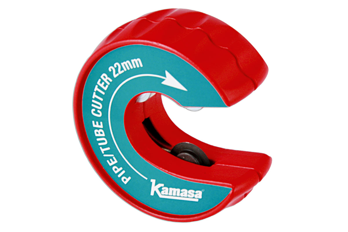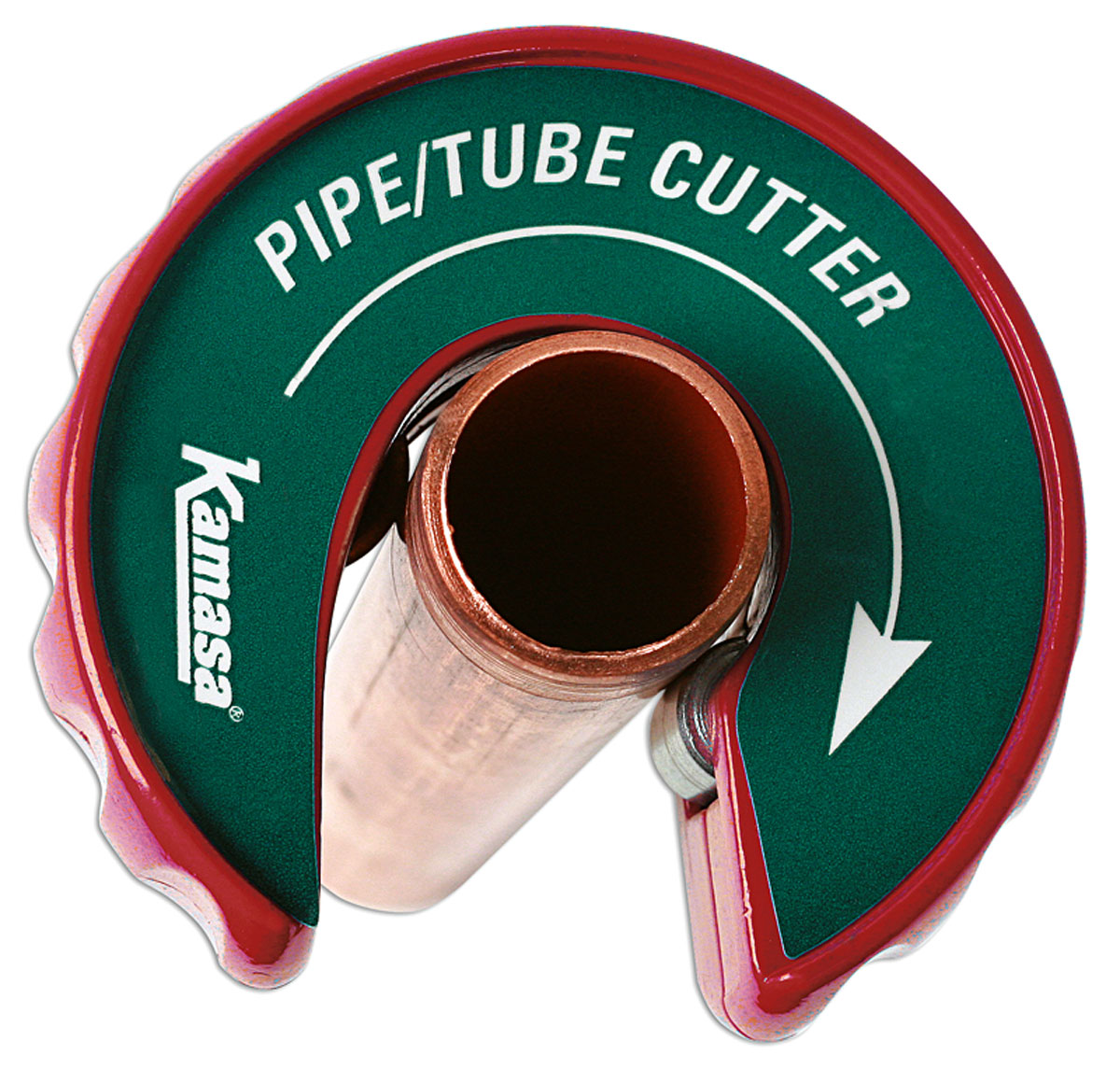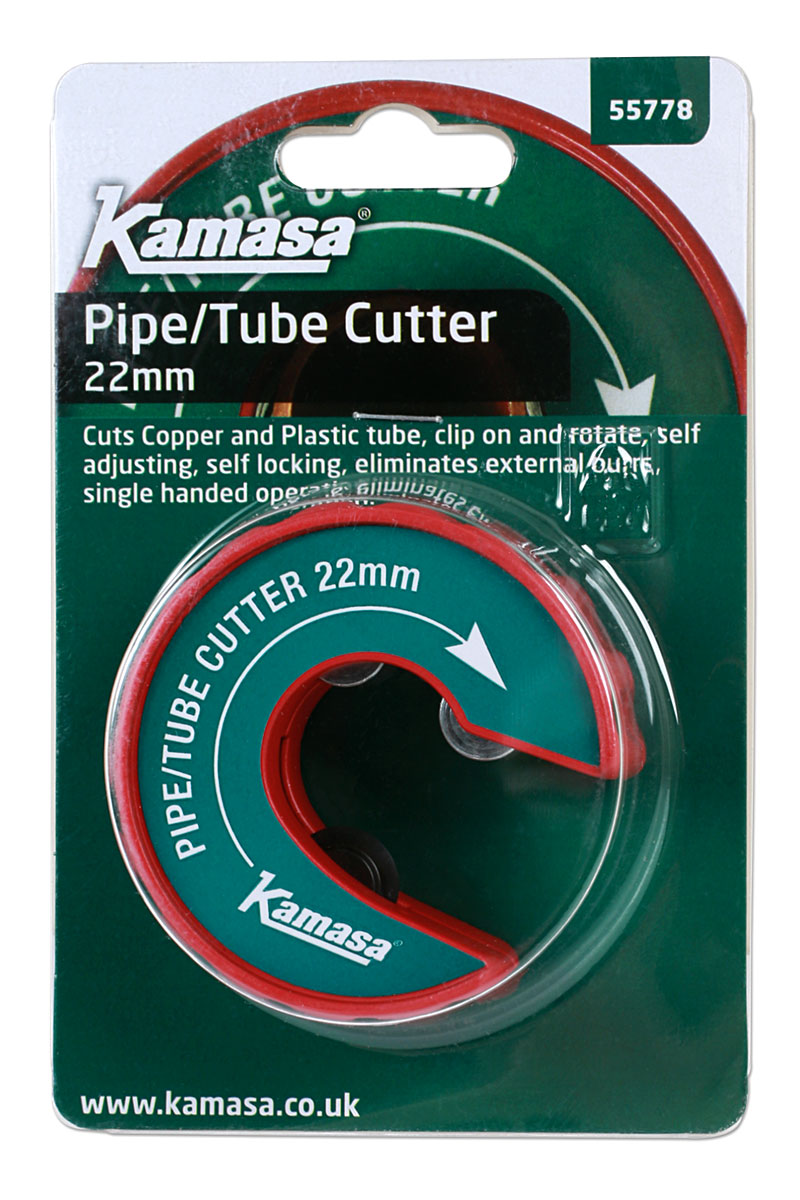 A pipe cutter which allows single handed operation and cuts copper and plastic pipes. Just clip on and rotate and the pipe will be cut cleanly without burred edges. Ideal for use by plumbers, kitchen/bathroom fitters and DIY enthusiasts.