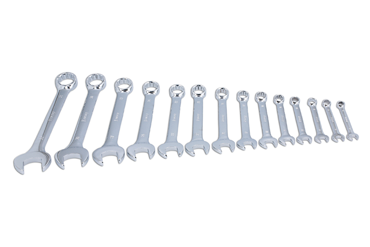 A 14-piece metric combination spanner set, open-end and Bi-Hex (12pt) ring, from 10mm to 32mm in a fully polished finish. They come supplied on a storage rack, which can either be hung on a wall for easy access, or used to keep the spanners organised in a tool box.