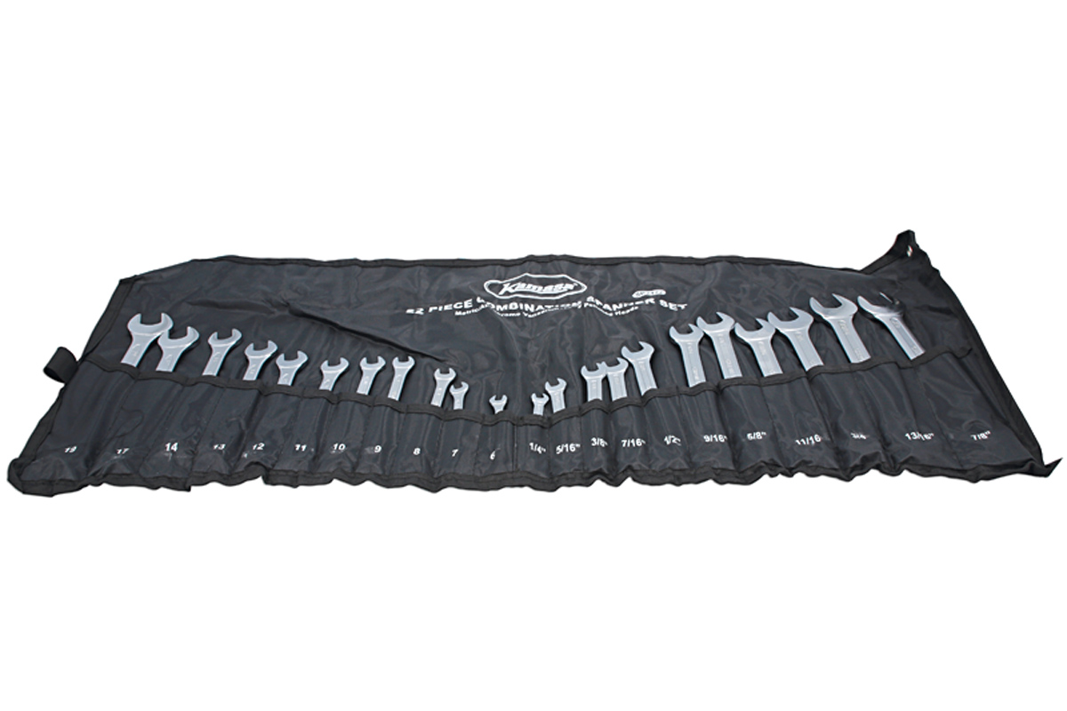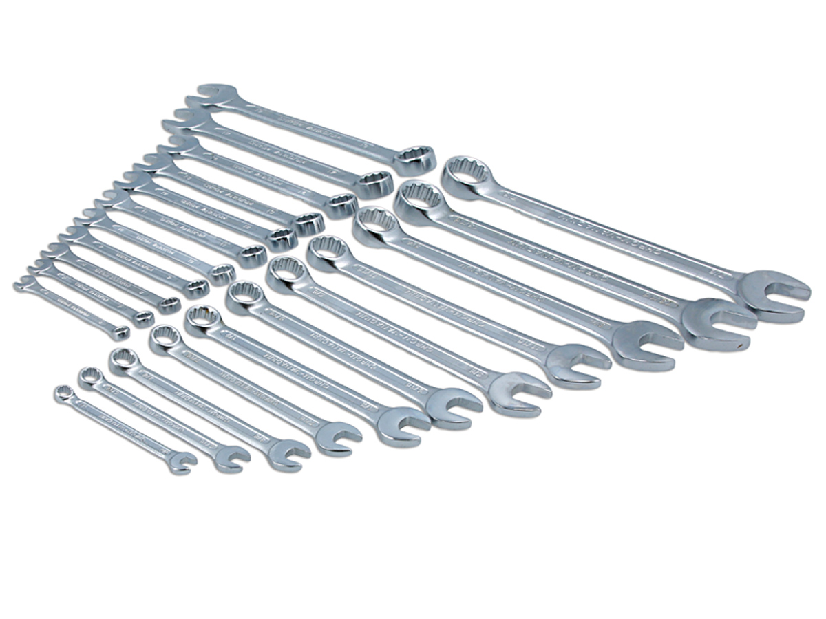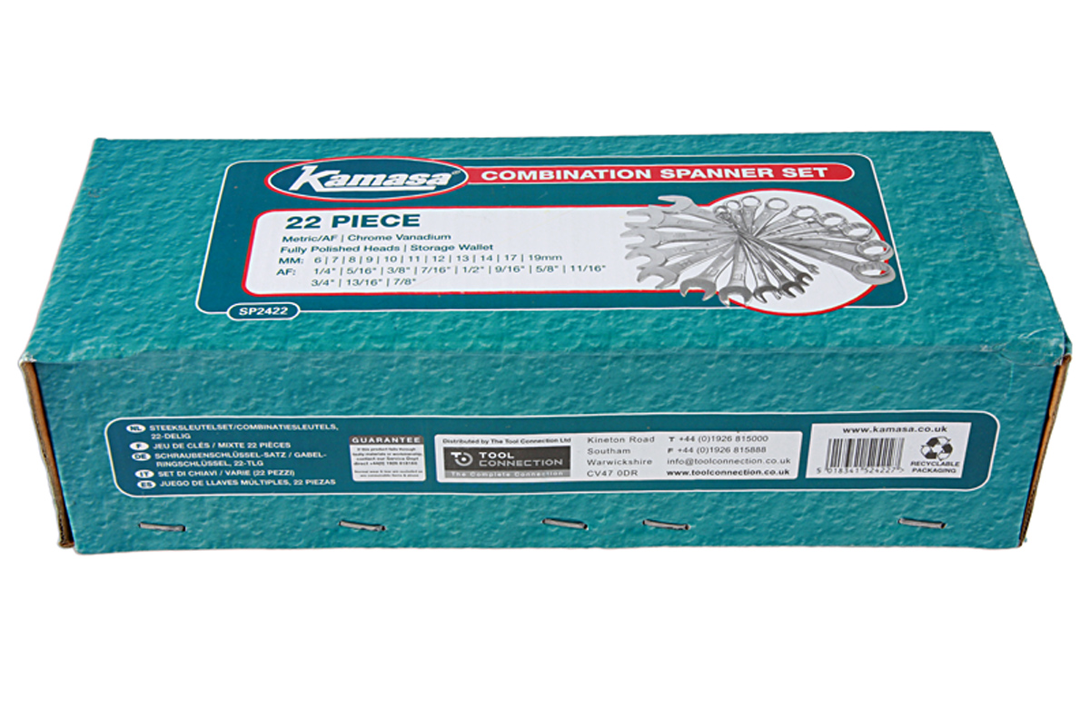 A 22 piece standard combination spanner set, combining both metric and imperial (AF) sizes. Manufactured from Chrome Vanadium, supplied in a useful storage wallet with eyelets for hanging on a workshop wall.